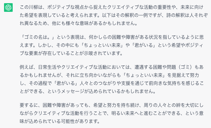 話題のChatGPTに今回の川柳の意味を聞いてみました。